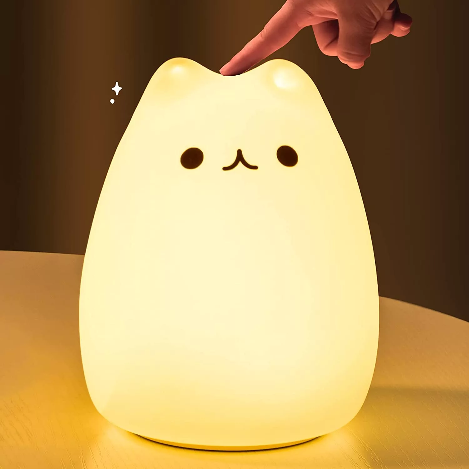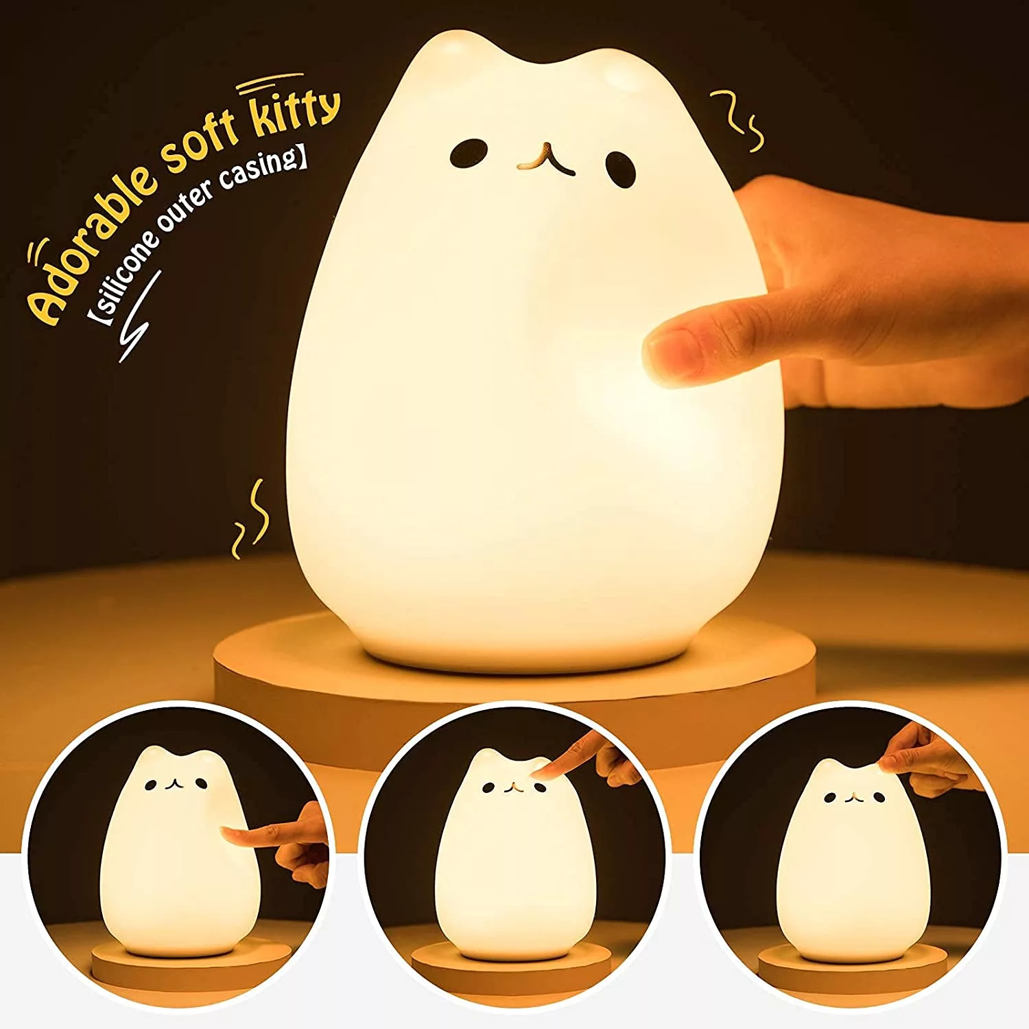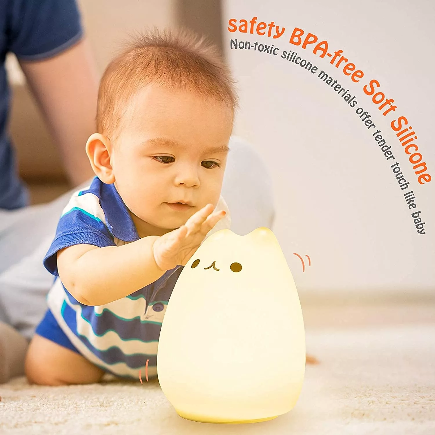 2) TAP CONTROL&DUAL LIGHT MODES: Children/Lover’s Night Lighting, Tap the soft silicone surface to switch among normal WHITE/WARM light mode, 7-color breathing light mode and standby mode, making it a romantic sweet nursery baby night lamp companion and it is easy to use as Bedside night lights.