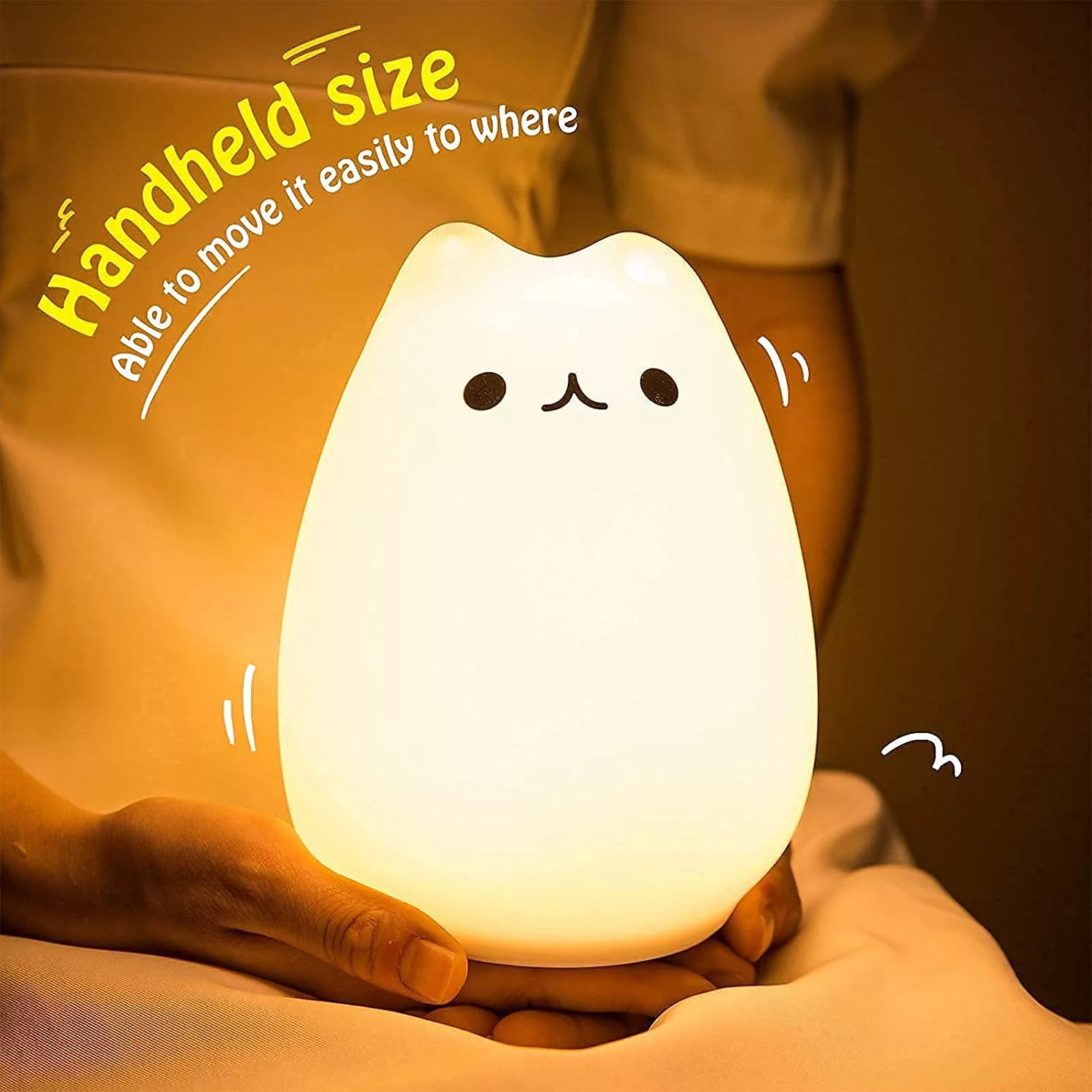 1) CUTE SMILEY FACE: Super cartoon light with lovely cat face gives a pleasantly soft touch because made by BPA-free washable silicone. It makes a perfect night decor for the bedroom bedside of study, baby room as well as a fabulous gift idea especially for kids. And the design of handhold size and eco-friendly for every people.